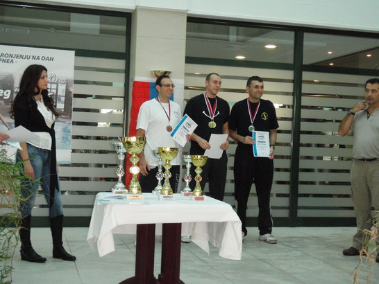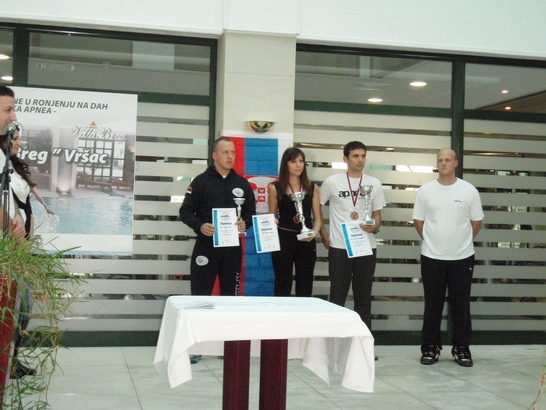 I ove godine, Instruktor M1 Dragan Perašević i R3 Savatović Slobodan su sa svojom ekipom iz KPA "Bela Crkva" organizovali takmičenje u Statičnoj apnei, ronjenju na dah. Na bazenu SPA centra Vila Breg u Vršcu, dana 27.11.2011. god. održano je prvenstvo Vojvodine i otvoreno prvenstvo CUP Vila Breg gde se okupilo oko 20 takmičara. Takmičenje se odvijalo na dva startna mesta na kojima su sudili Karjuk Aleksandar internacionalni AIDA sudija i Savatović Slobodan, nacionalni AIDA sudija. Obrada rezultata ARI program, AK. Nagrade su deljene u pojedinačnoj kategoriji i ekipno, kako za Prvake Vojvodine tako i za CUP Vila Breg. Još jedno lepo takmičenje i okupljanje mladih, gde su organizatori pokazali već poslovičnu ljubaznost. |